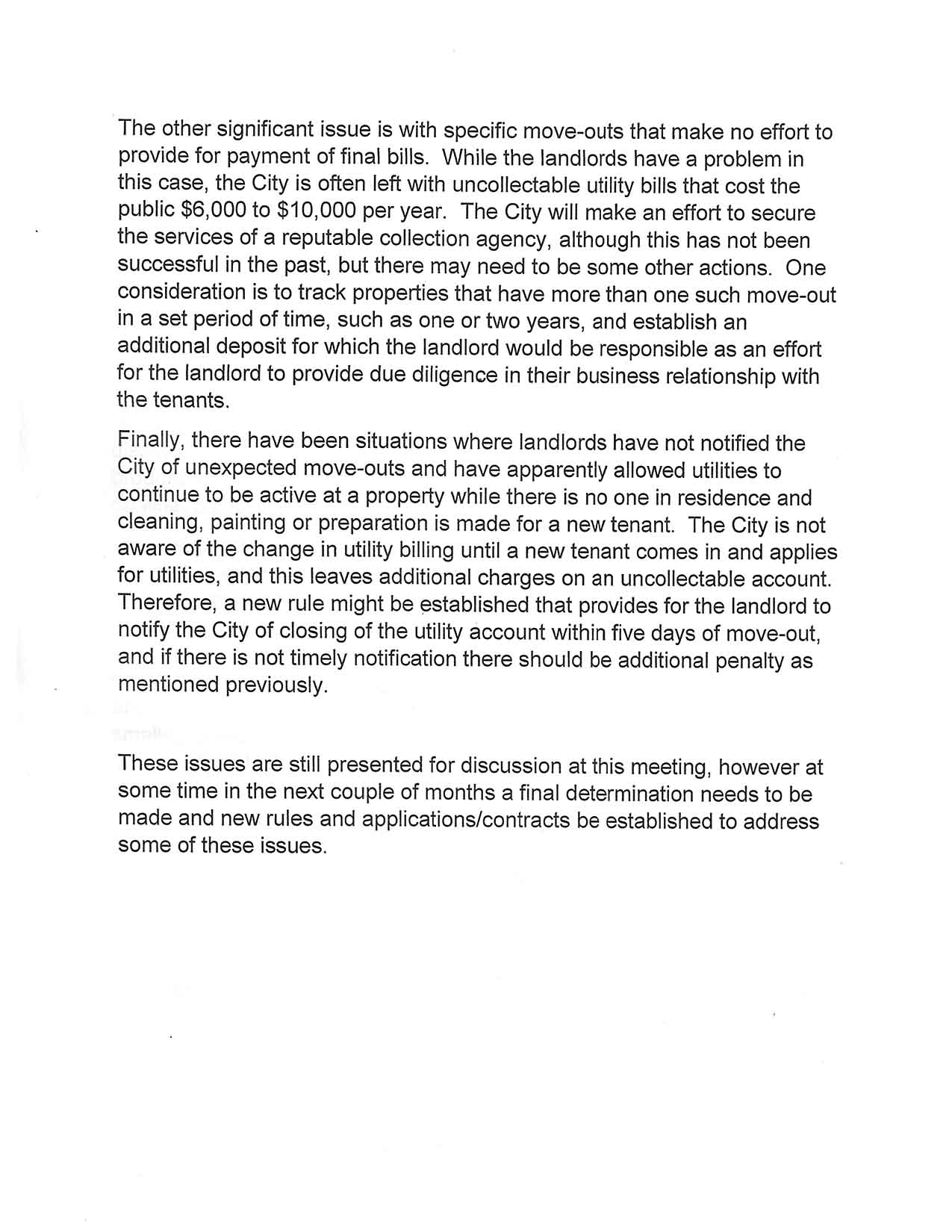 The issue was not resolved and the city council agreed to discuss it at the next meeting. The city also asked landlords to come up with a proposal of what would be acceptable to us in regards to resolving the issue.